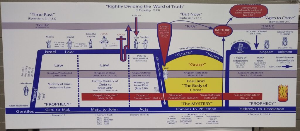 Next Sunday, we will look at the three major divisions of the seven dispensations on the board from innocence to the kingdom.  The three major divisions on the chart are “Time Past”, “But Now”, and “Ages to Come”.  We will start unpacking how these three major divisions affect us in the Mystery period known as the Dispensation of Grace.